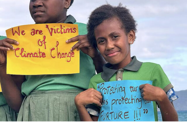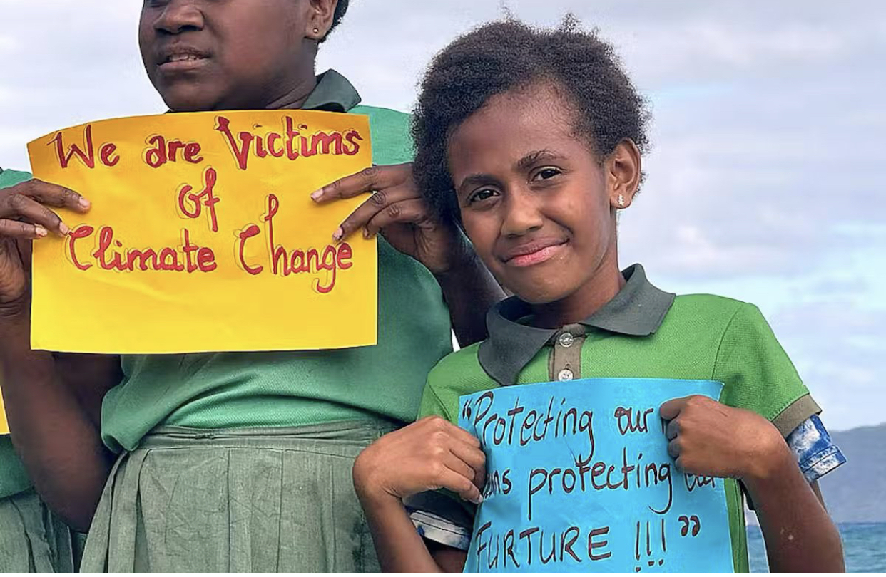 Vanuatu and other Pacific nations have offered a broadly united front on climate change. But deep-sea mining may risk this unity. Pictured: Vanuatuan schoolchildren holding signs about climate change. Hilaire Bule/Getty